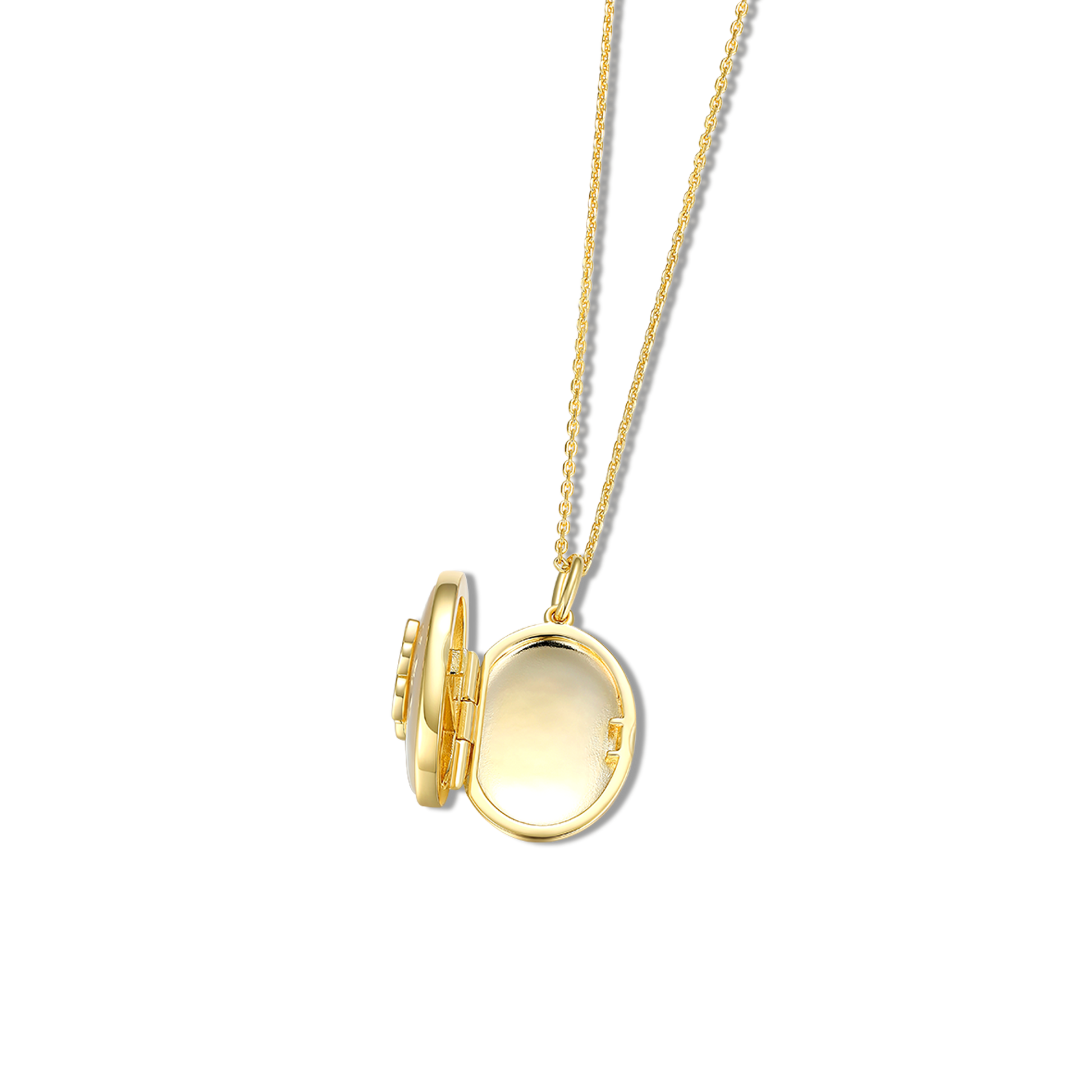 A symbol of transformation and grace, the Papilio Whisper Locket combines the luminous glow of mother-of-pearl with a golden butterfly — guarding your engraved words within.