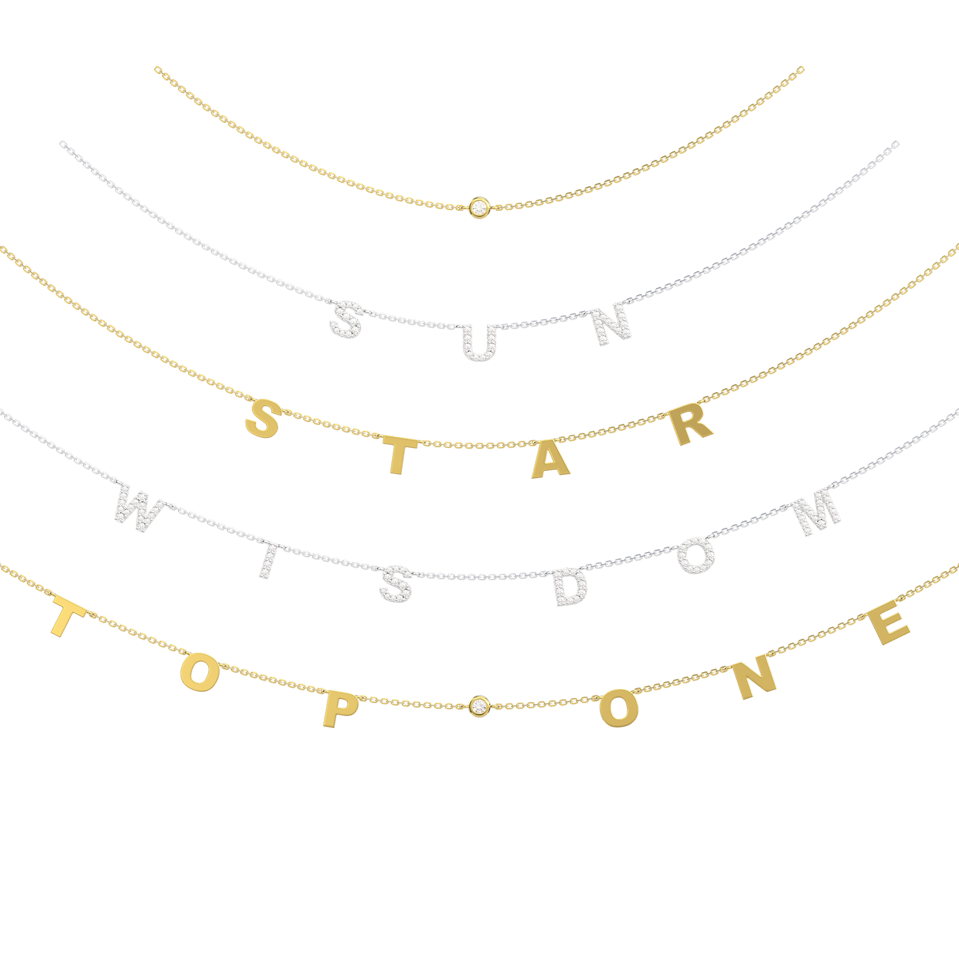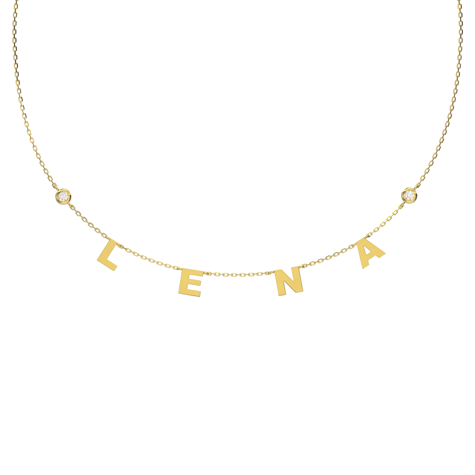 This Spaced Letter necklace combines minimalist design with a flat ring structure that keeps each letter aligned and comfortable to wear. Chain segments between letters create a light, elegant look. Available in gold and white gold, with optional diamond accents, you can personalize up to 9 letters or stones to create a one-of-a-kind piece.