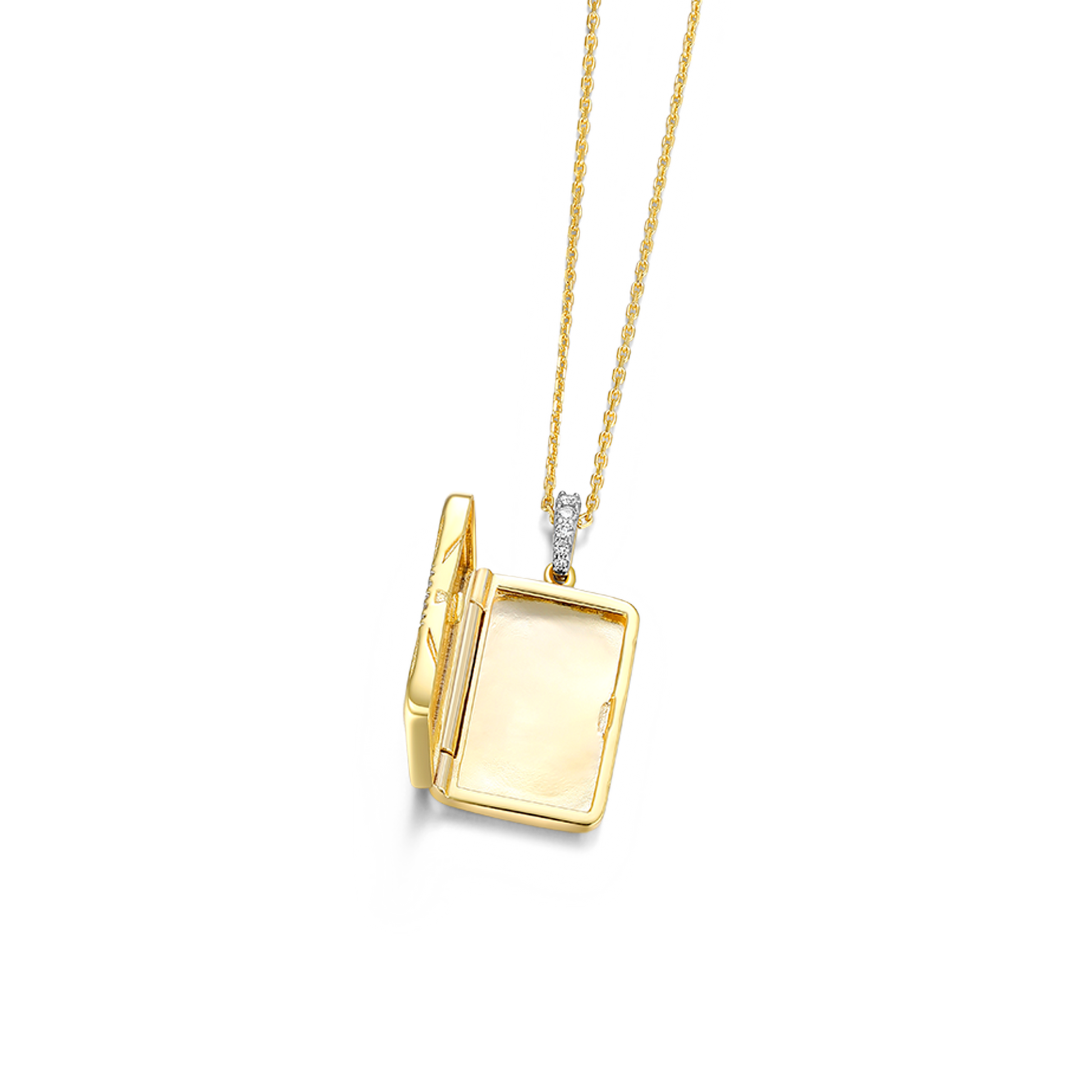This stunning locket features a rectangular gold plate, engraved with a burst of sun rays that emerge from a cluster of shimmering pavé-set stones. Like the first light at dawn, the design captures a moment of hope, clarity, and quiet strength. The polished gold surface reflects warmth and elegance, while the radiant pattern adds a touch of brilliance and purpose. Perfect for marking milestones or gifting someone a token of light in their journey.