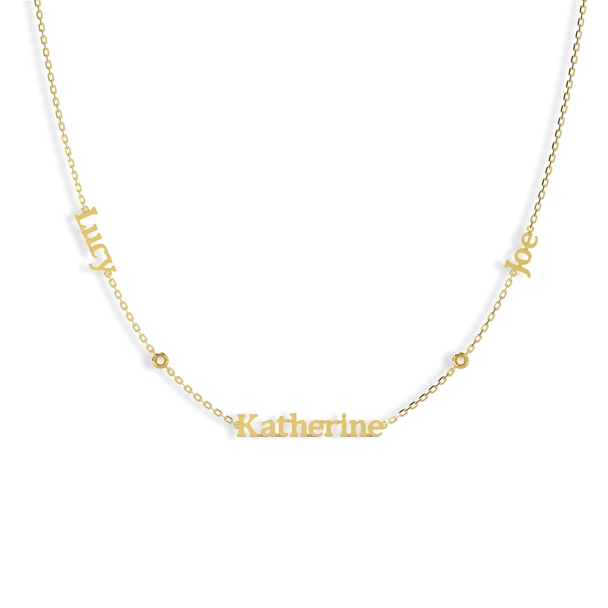 Celebrate your most meaningful connections with this customizable name necklace. Choose one to three names—family, friends, or loved ones—and link them with sparkling CZ stones that represent the invisible thread of love between you. Available in your choice of metal, font style, and with or without diamond accents, it’s a piece as personal as the people you wear it for.