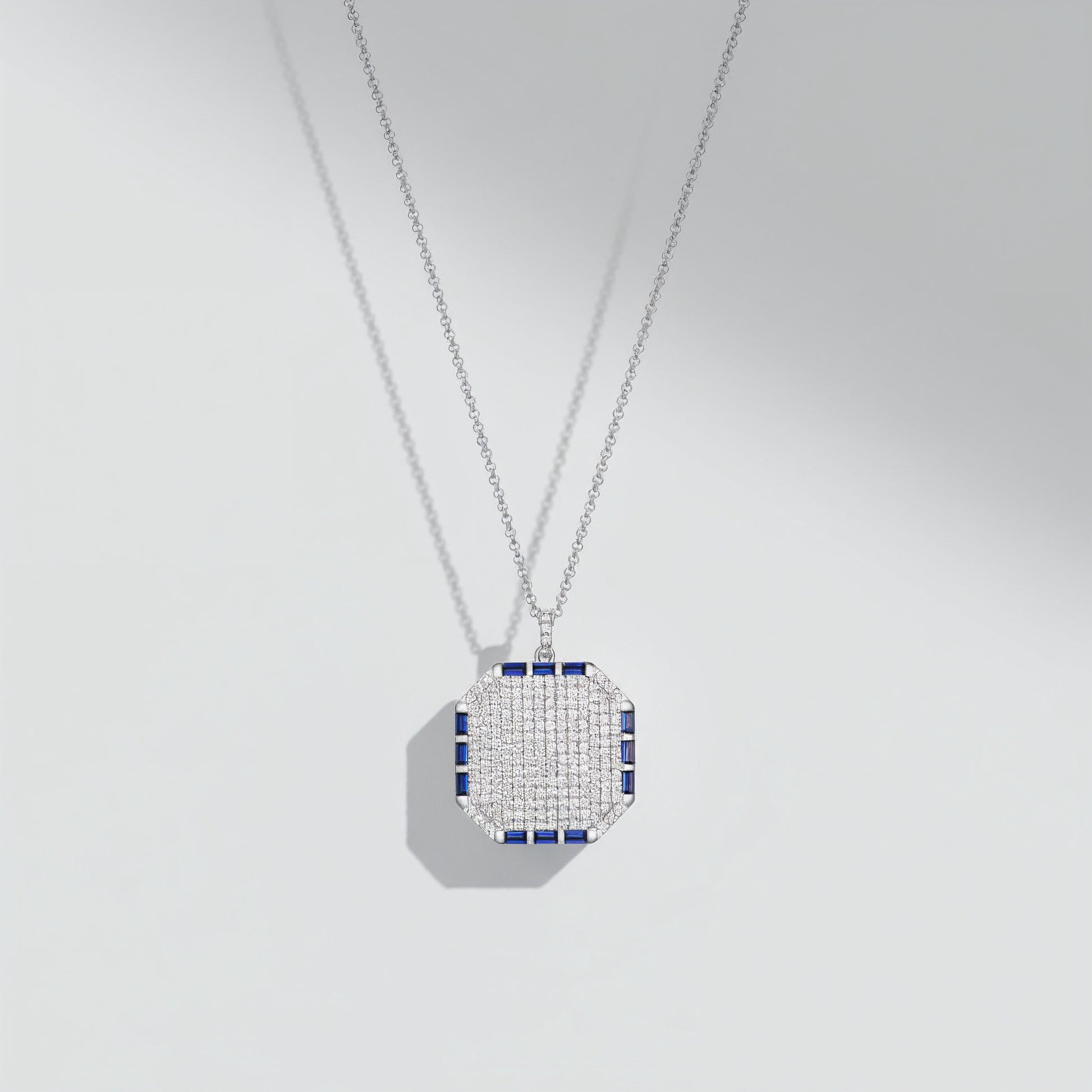The Modern Halo Locket redefines elegance through bold geometry. Set in an octagonal silhouette, the front dazzles with pavé-set white cubic zirconia, radiating brilliance in layered harmony. Sapphire-hued baguette stones trace its edges, forming a glowing celestial halo full of modern mystery. On the back, a custom engraving area invites you to inscribe a name, a date, or a quiet message—transforming this locket into a personal emblem of memory and meaning. A radiant accessory. A timeless statement. A heart's quiet whisper in gold.
